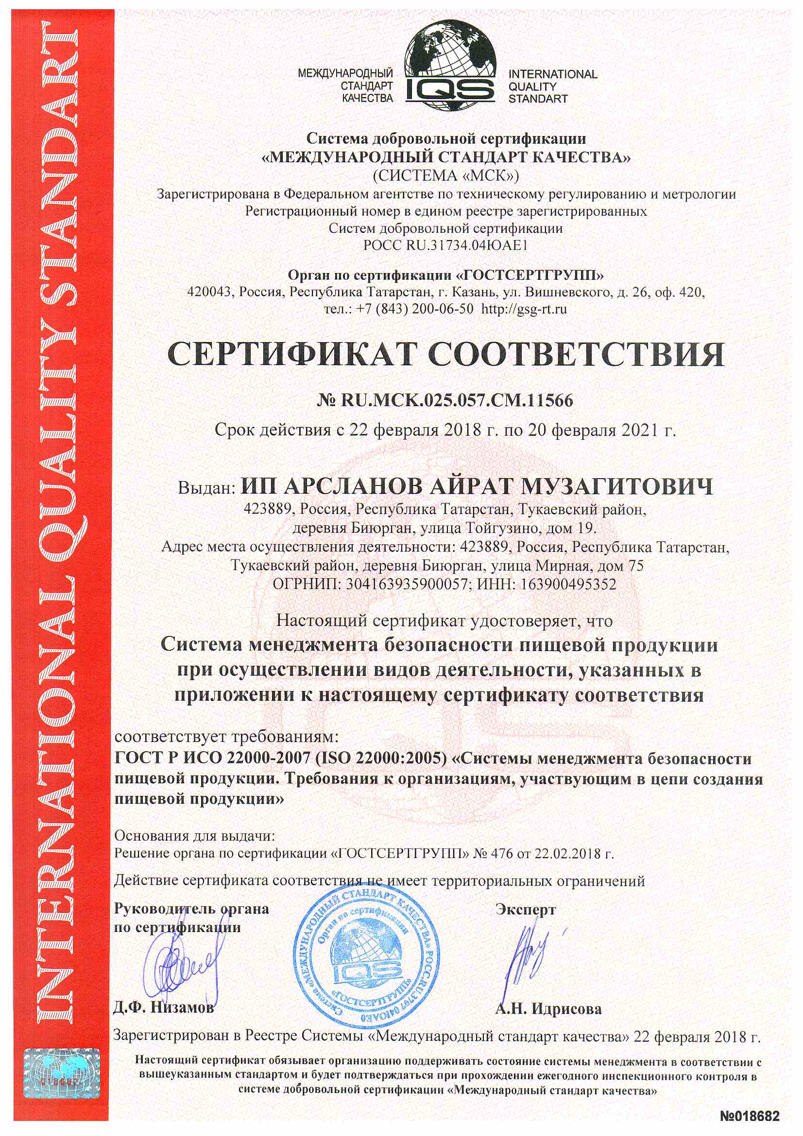 Сертификационные проверки проводятся в соответствии со схемами системы добровольной сертификации, зарегистрированной на сайте Федерального агентства по техническому регулированию и метрологии, «Международный стандарт качества» Рег.№ RU.МСК.ОС.025.