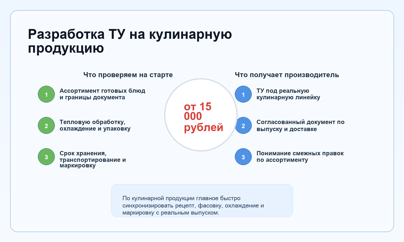 Подготовим технические условия на кулинарную продукцию так, чтобы документ совпадал с рецептурой, тепловой обработкой, упаковкой, сроком хранения и маркировкой.